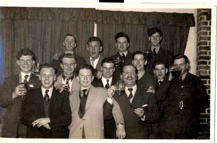 118 Sqn party at Fassberg about 1952/53. L to R: Unknown, Unknown, Unknown back, Unknown, Mickey Upton front, Unknown back, Doug Durrant, Unknown back, Larry Lamb front, Pete Kilvington, Unknown back, Unknown, Unknown drinking. (Thanks Wilf Crutchly>.) |