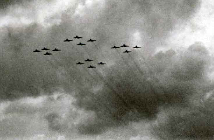 Squadrons flypast along runway 29 with skies darkening - 2Jul54.