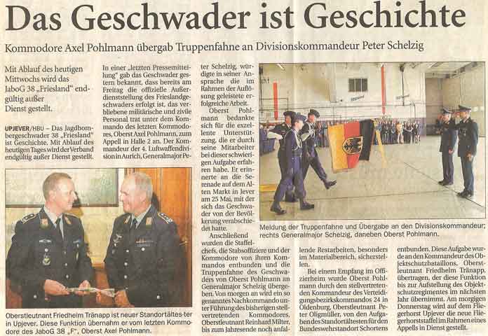 At a reception held in the Officers Mess Oberst Pohlmann was relieved of his command as CO of the Bundeswehr Unit Jever by the Deputy Commander of the 24th Area Defence Command in Oldenburg, Oberstleutenant Peter Oligmüller. This task has now been passed on to the Battalion CO of the Luftwaffe