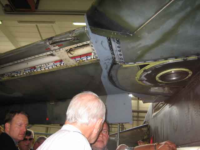 170. This is a very important part of the "swing-wing" Tornado. The circular feature on the right is the "axle" around which the wing swivels. This is looking aft and it shows, just in front of the tailplane, the flexibly sealed glove slot into which the wing slides as it is swept aft. This "axle" is a heavy piece of engineering and the metal is worth a lot of money so they have to slide this hinge bolt out to get the wing off and recover the metal. To do that they pour liquid nitrogen in to the centre of the bolt and then , when it has cooled and shrunk, they use a hydraulic press to force out the bolt.